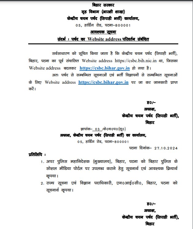 आधिकारिक वेबसाइट पर प्रकाशित अधिसूचना में कहा गया है कि "सभी को सूचित किया जाता है कि केंद्रीय चयन पर्षद (पुलिस भर्ती), बिहार, पटना की आधिकारिक वेबसाइट का पता https://csbc.bih.nic.in से बदलकर https://csbc.bihar.gov.in हो गया है। अतः पर्षद की अधिसूचनाओं एवं भर्ती अपडेट से संबंधित जानकारी के लिए कृपया नई वेबसाइट के पते https://csbc.bihar.gov.in पर जाएं।"