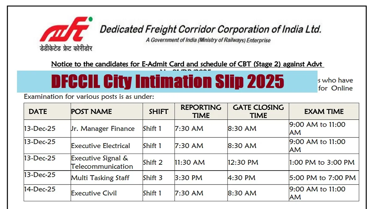 DFCCIL Admit Card 2025: The Dedicated Freight Corridor Corporation of India Limited (DFCCIL) will release today, on November 26, the City Intimation Slip for the Computer-Based Test (CBT) Stage 2 on its official website. The detailed message & e-mail sent on regarding the City Slip will be sent to candidates through the registered e-mail id & mobile number on Nov 26, 2025. The E-admit Card Link will be made live on December 09, 2025 on DFCCIL website.