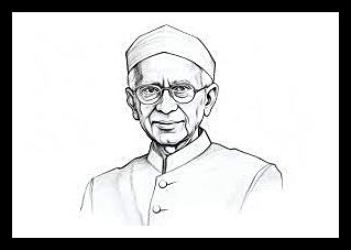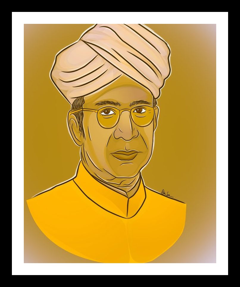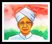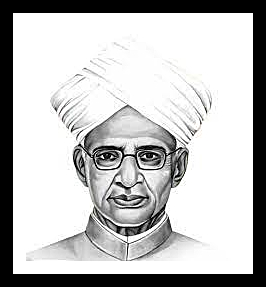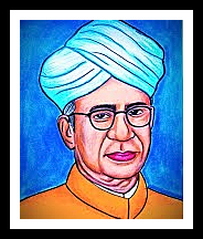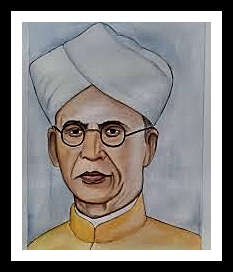 - A drawing of Dr. Sarvepalli Radhakrishnan, in a white shirt and glasses reflecting wisdom and intellect.