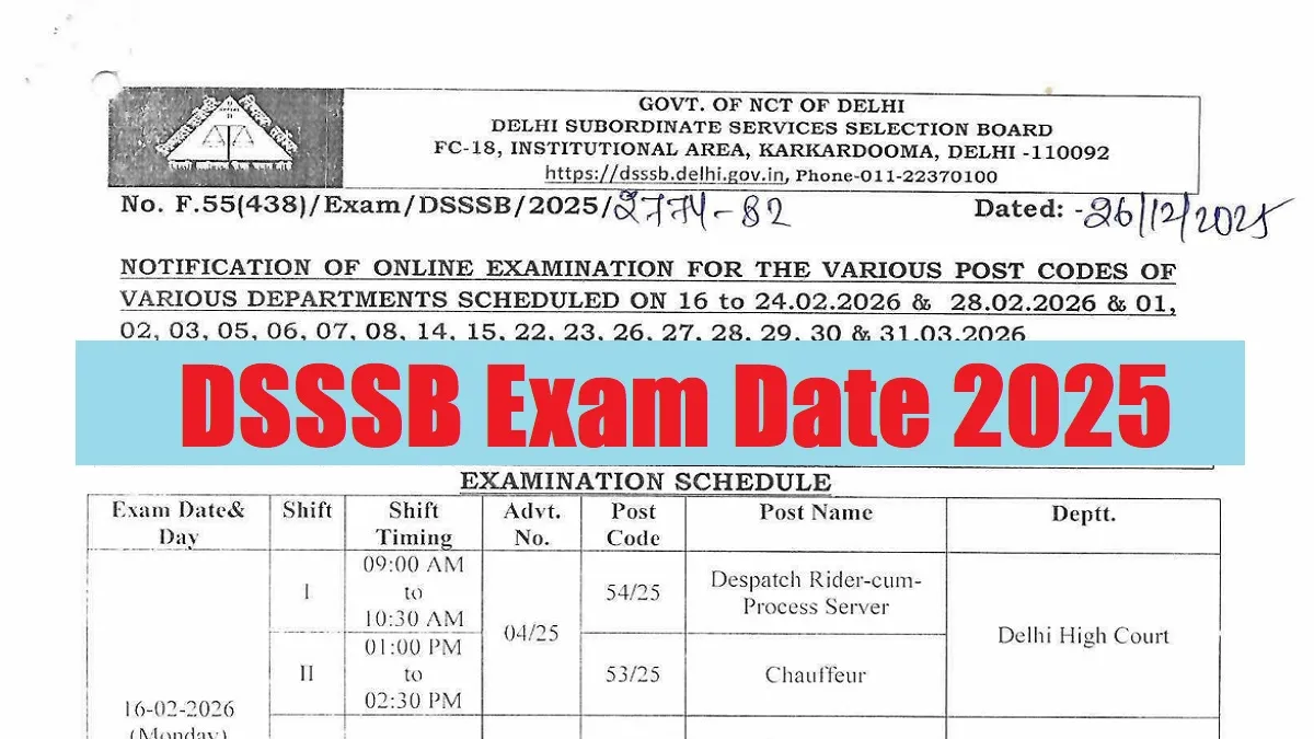DSSSB Exam Date 2025 OUT: The Delhi Subordinate Service Selection Board (DSSSB) on December 26, has announced the detailed exam schedule for various teaching and non-teaching posts including Assistant Teacher, TGT, PGT, Bailiff, Junior Engineer, Naib Tehsildar, Assistant Security Officer and others. The written exam will be conducted in multiple days in the month of February/March 2026 as per the schedule given on the notification. The board will soon release the exam hall ticket for the above posts containing the details of examination centre, date, and timing on its official website.
