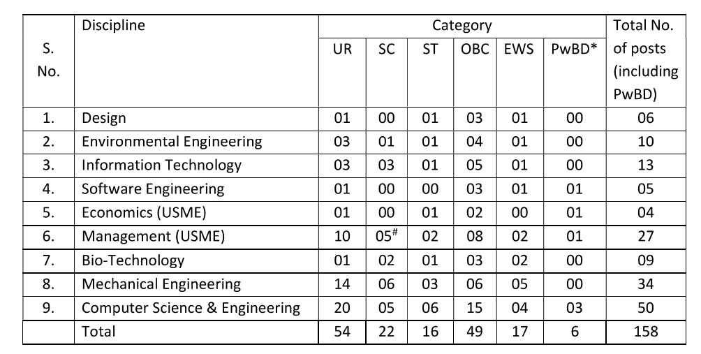 | 158 | असिस्टेंट प्रोफेसर | संबंधित क्षेत्र में पीजी + पीएच.डी./ नेट/ एसएलईटी/ सेट (विस्तृत शैक्षिक योग्यता के लिए अधिसूचना चेक करें के लिए अधिसूचना देखें) | डीटीयू सहायक प्रोफेसर भर्ती 2024 के लिए आयु सीमा 18-35 वर्ष है। आयु सीमा की गणना के लिए निर्णायक तिथि 14.4.2024 है। आयु में नियमानुसार छूट दी जाएगी. |