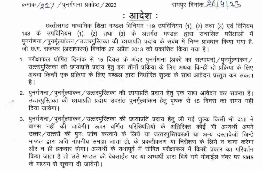 छत्तीसगढ़ बोर्ड के 10वीं और 12वीं का रिजल्ट 10 मई को घोषित कर दिया गया. जो छात्र अपने प्राप्त अंक का रिकैलकुलेशन (पुनर्गणना) करना चाहते है तो उन्हें प्रति सब्जेक्ट 100 रूपये की फ़ीस जमा करनी होगी. रिकैलकुलेशन वह प्रक्रिया है जिसमें छात्र द्वारा प्राप्त नंबर को पुनः काउंट किया जाता है.