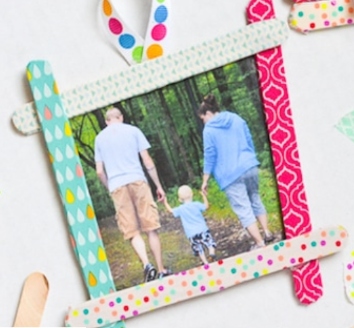 This craft is super easy, even for the littlest ones. They can choose colorful washi tape and put it around craft sticks. Then, these sticks become a frame that can hang on the wall. It's a fun project for everyone to enjoy!