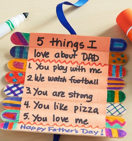 Dad could hang this card in his office to show off the awesome things about him to his coworkers. Kids can decorate the craft sticks with markers before gluing them together, along with the paper where they wrote five things they love about Dad. It's a neat way to make Dad feel proud and loved!