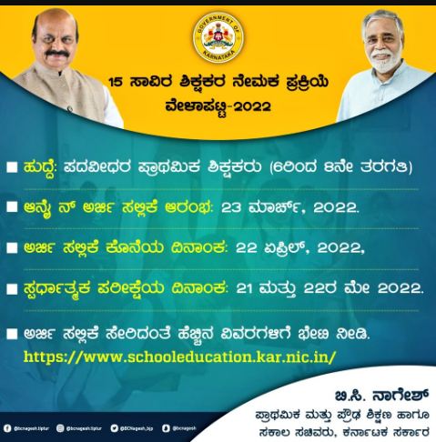 Eligible and interested candidates can apply online from 21 March to 22 April 2022 at schooleducation.kar.nic.in.