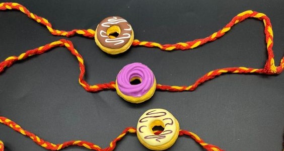 Design 5: If you or your brother likes doughnuts, then this design is for you. Make simple doughnut designs with the help of cotton and cardboard and paste them on a string to make the final rakhi look.