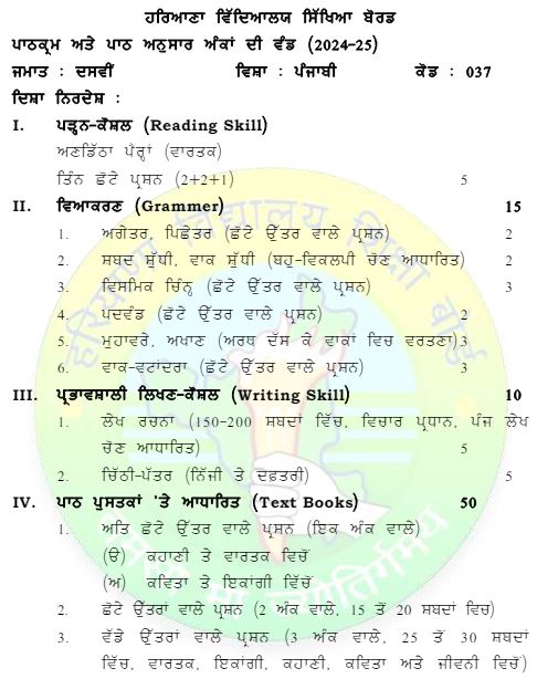 HBSE Class 10 Punjabi (Code - 037) Marking Scheme 2024-25