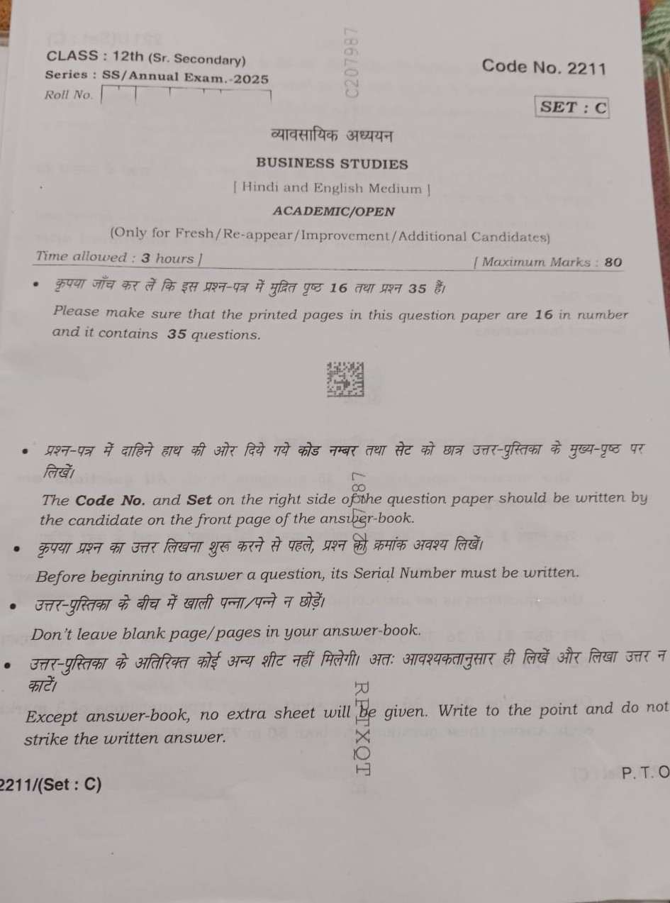Below is the provided set for HBSE Class 12th Business Studies Question Paper 2025.