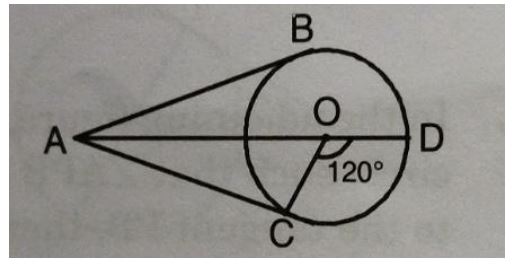 7.In the adjoining figure,AC and AB are tangents to a circle with centre at O. If ∠COD = 120°,then ∠BAO is equal to