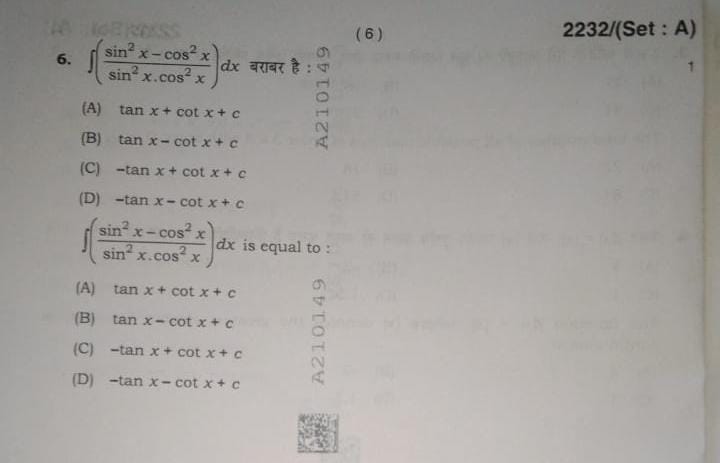 Correct Answer: (D) -tan x - cot x + C