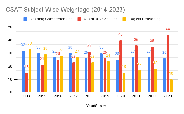 Candidates must thoroughly analyse the CSAT syllabus before commencing the preparation. Acquiring knowledge about all the topics covered in this exam will help you to prepare an exam-orient strategy. It will help you focus on topics from which questions can be asked in the exam. With this, they must also check the exam pattern to get an insight into the question structure, number of sections, marking scheme, and other exam requirements. This will help them to curate the UPSC Prelims CSAT strategy based on the latest trends, approaches and topic-wise weightage. Check the table below for subject wise questions asked in CSAT over the years.