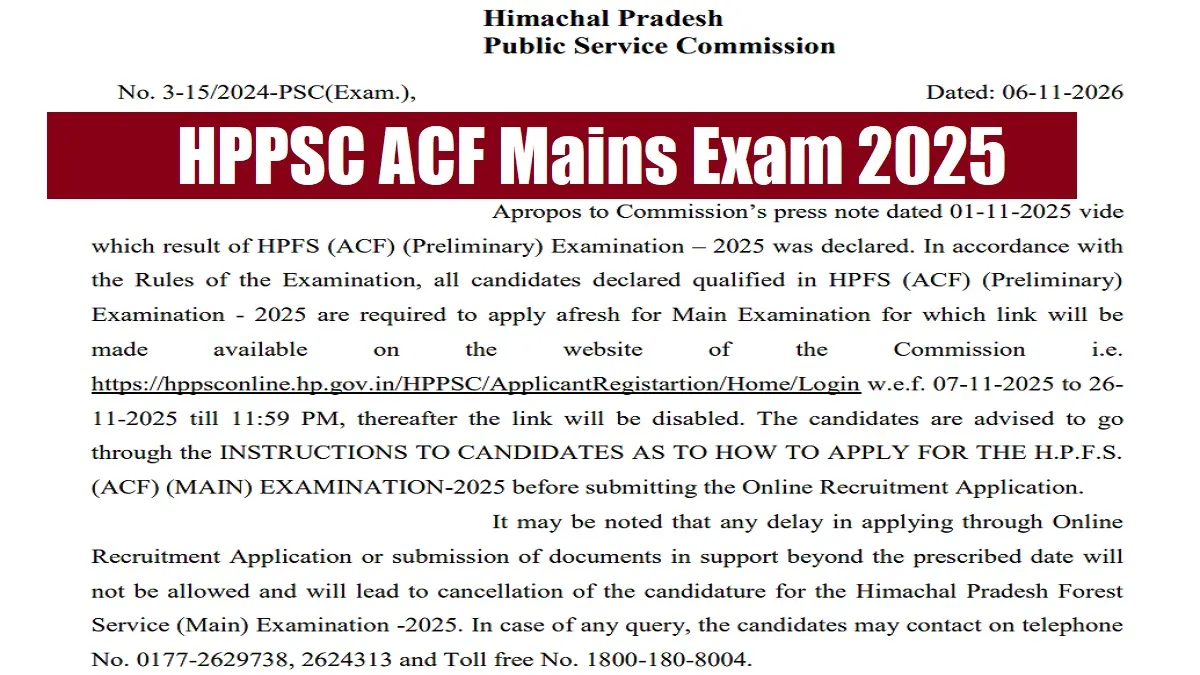 HPPSC ACF Mains Exam 2025: Himachal Pradesh Public Service Commission (HPPSC) on November 06, 2025 has released short notice regarding the online application process for the HPFS (ACF) (Mains) Examination – 2025. The online application process will commence from November 07, 2025. All those candidates qualified in the HPPSC HPFS (ACF) (Preliminary) Examination – 2025 can apply online for H. P. Forest Service (Assistant Conservator of Forests) (Mains) Examination-2025 through the official website on or before November 26, 2025 at https://hppsc.hp.gov.in.
