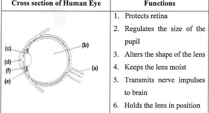 | (v) Given below is a cross section of the human eye. Match the structures marked (a) to () with their correct functions: Example: (f) - 6. Holds the lens in position