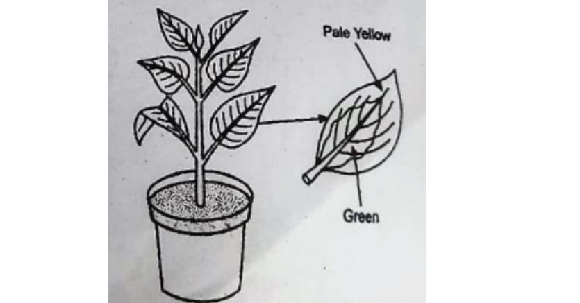 (v) A potted plant with variegated leaves was kept in dark for 24 hours and then placed in bright sunlight. Answer the following questions: