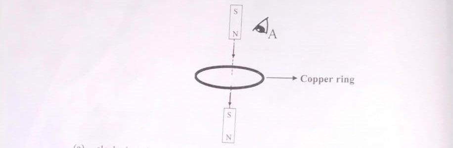 (The diagram shows a bar magnet passing through a copper ring, with observer A positioned at the top.)