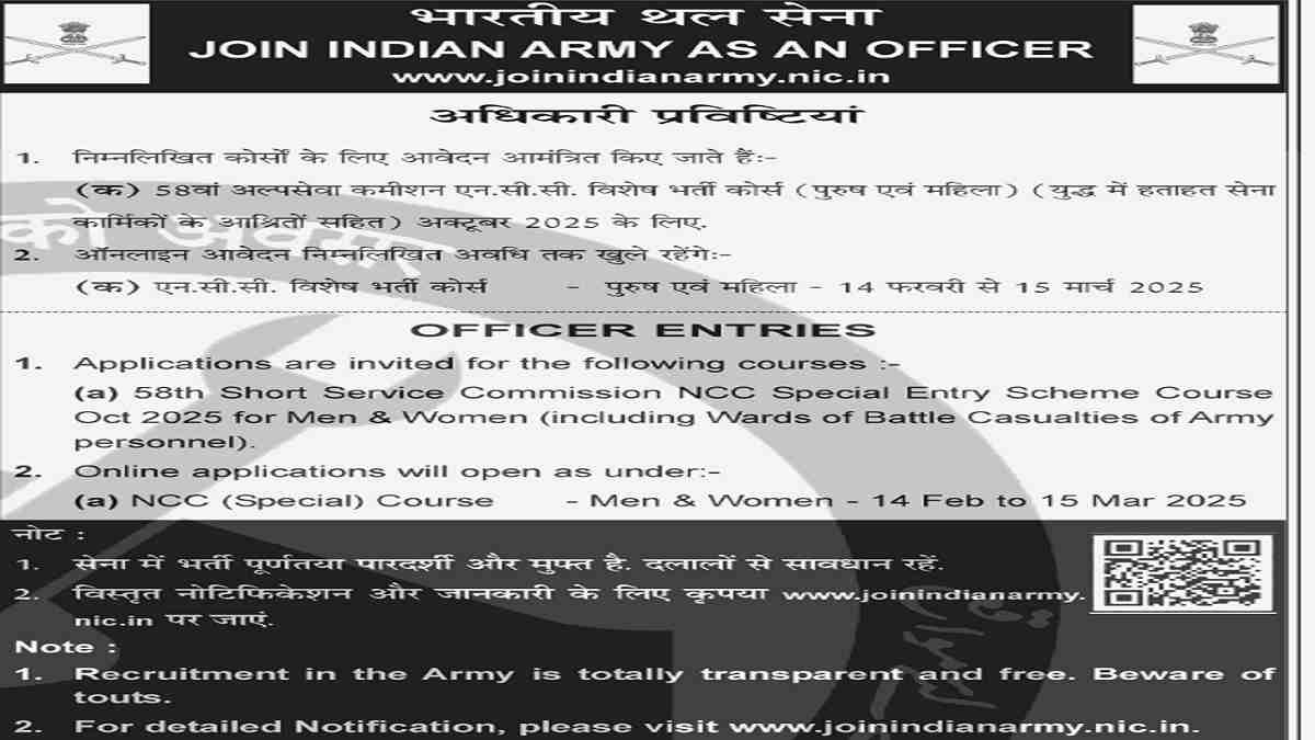 Indian Army Recruitment 2025: The Indian Army has released a short notification for 58th Short Service Commission NCC Special Entry Scheme Course October 2025. The online application process for the 58th Short Service Commission NCC Special Entry Scheme Course October 2025 will be commenced from February 14, 2024.