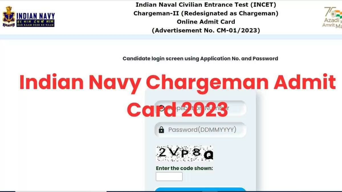 Indian Navy Chargeman Admit Card 2023: भारतीय नौसेना द्वारा इंडियन नेवी चार्जमैन एडमिट कार्ड 2023 जारी कर दिए गए हैं। उम्मीदवार अपना एडमिट कार्ड indiannavy.cbexams.com से डाउनलोड कर सकते हैं साथ ही उम्मीदवार नीचे दिए गए डायरेक्ट लिंक के जरिये भी अपना एडमिट कार्ड डाउनलोड कर सकते हैंI उम्मीदवार अपना एप्लीकेशन नंबर और पासवर्ड दर्ज कर के अपना एडमिट कार्ड डाउनलोड कर सकते हैंI बिना एडमिट कार्ड के उम्मीदवारों को परीक्षा केंद्र में प्रवेश नहीं दिया जायेगाI