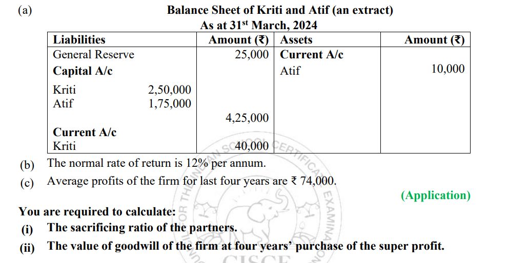 | Kriti and Atif are partners sharing profits and losses equally. On 31st March, 2024, they admitted David as a third partner for ⅕ share in the profits. It is decided that on David’s admission: • Atif would retain his original share • Goodwill would be valued by the super profit method on the basis of the following Information:
