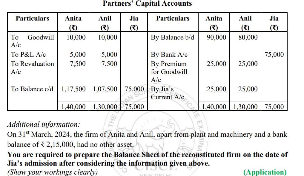 | Anita and Anil are partners in a firm. On 1st April, 2024, they admitted Jia as a third partner. The capital accounts of the partners after considering the following adjustments on Jia’s admission are given below: (a) Loss on revaluation due to depreciation on machinery @ 20% per annum. (b) The General Reserve maintained in the old firm was not to be disturbed in the reconstituted firm.
