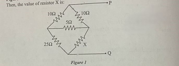(i) When a battery is connected between the terminals P and Q, as shown in Figure 1 below, it is found that no current flows through 5Ω resistor. Then, the value of resistor X is: