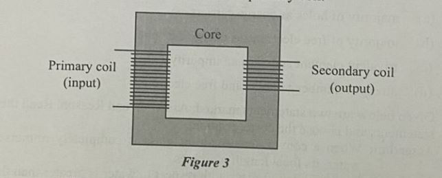 (ii) Figure 3 below shows an ideal transformer. Explain why the current flowing through the secondary coil is greater than that in the primary coil.