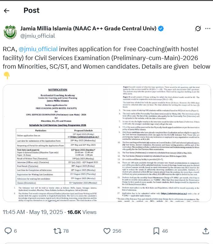 | Jamia Millia Islamia Free Residential Coaching 2025-26 |