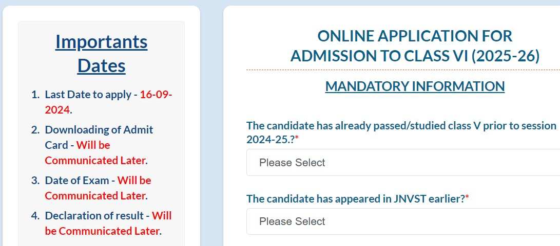 The registration window for JNVST 2025 for class 6 admissions will close on September 16, 2024.
