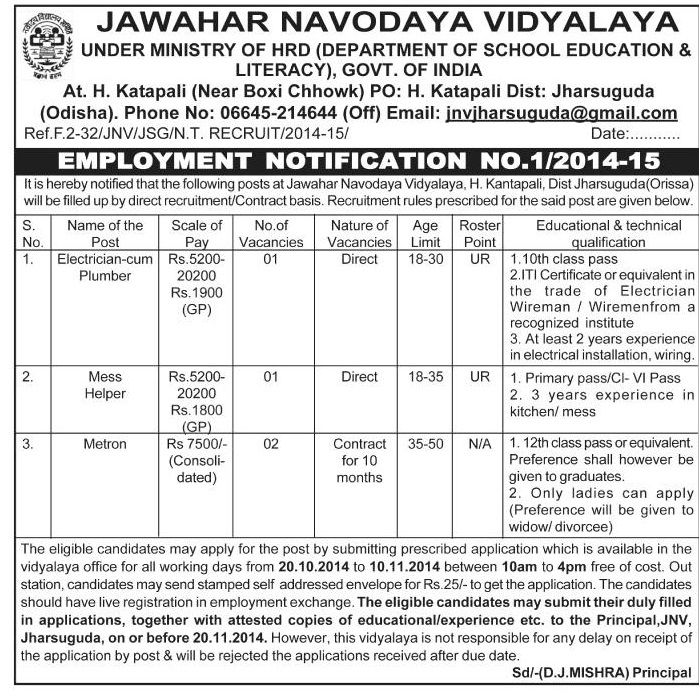Jawahar Navodaya Vidyalaya, under Ministry of HRD, Government of India invited applications for recruitment to 4 non-teaching posts by direct recruitment/contractual basis at H Kantapali, District Jharsaguda (Orissa). Interested candidates can apply before 20 November, 2014.