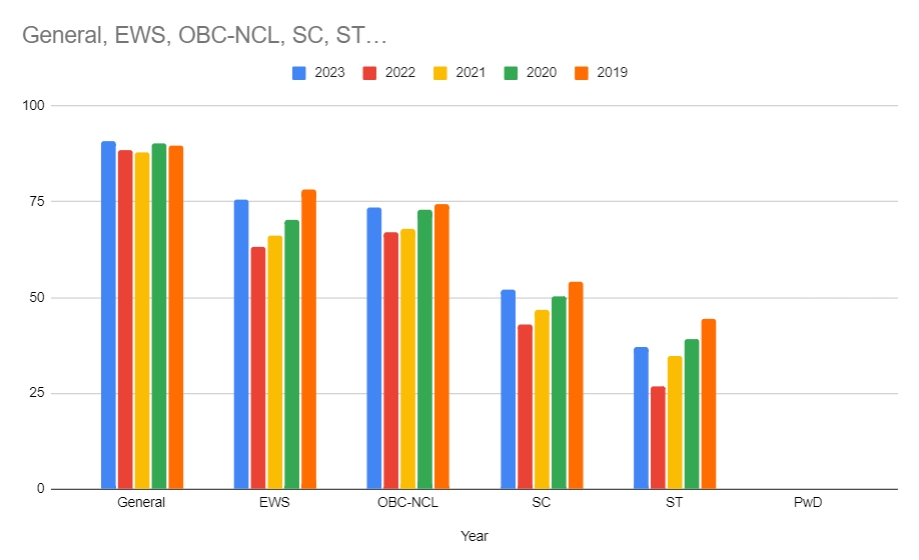 |   Year  |        General  |        EWS  |        OBC-NCL  |        SC  |        ST  |        PwD  |