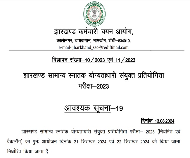 JSSC CGL Exam Date 2024: झारखंड में सरकारी नौकरी की चाहत रखने वाले उम्मीदवारों के लिए एक बड़ी खबर यह है कि झारखंड कर्मचारी चयन आयोग (JSSC) ने संयुक्त स्नातक स्तरीय (CGL) परीक्षा की पुनः परीक्षा की नई तिथियों की आधिकारिक घोषणा कर दी है। यह परीक्षा, अब 21 और 22 सितंबर 2024 को विभिन्न केद्रों पर आयोजित की जाएगी। जो उम्मीदवार JSSC CGL परीक्षा के लिए पहले ही रजिस्ट्रेशन कर चुके हैं, वे एडमिट कार्ड और परीक्षा पैटर्न के बारे में अधिक जानकारी और अपडेट के लिए JSSC की आधिकारिक वेबसाइट jssc.nic.in पर देख सकते हैं।
