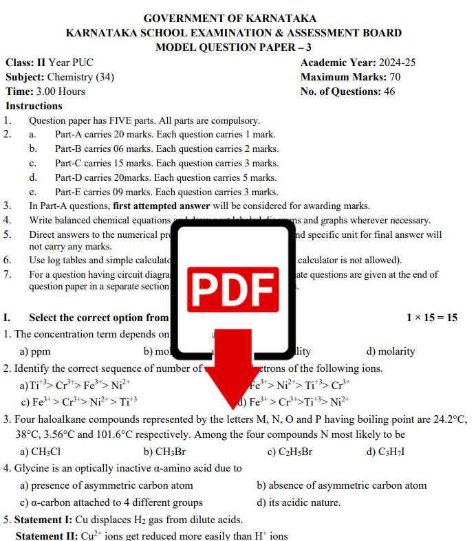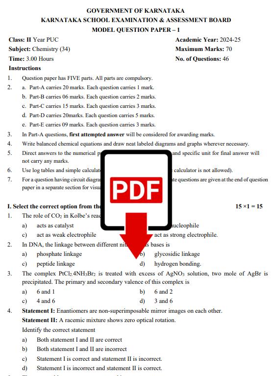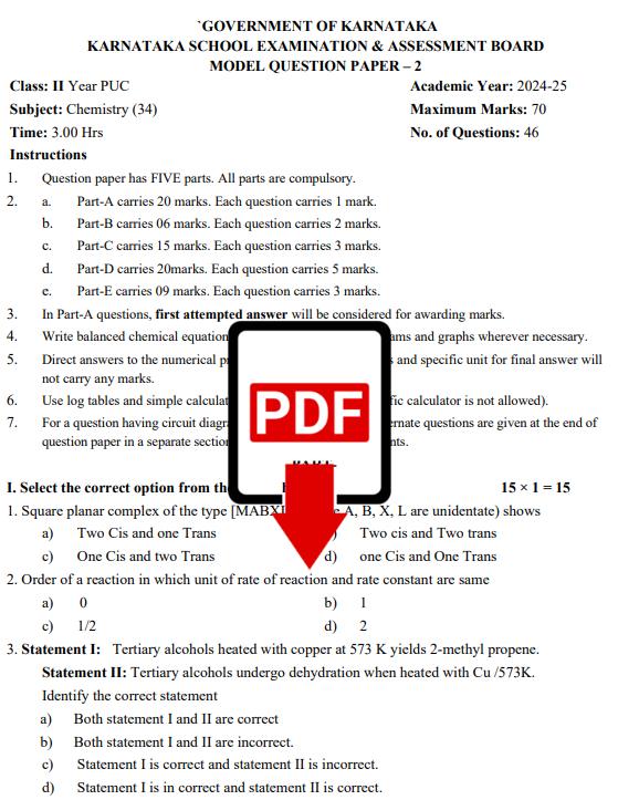 The Karnataka board has released the 2024-25 model paper for Class 12 Chemistry. This time the board has released multiple sample papers each with its separate blueprint to give students a diverse learning experience. Check and download all three sample papers from below: