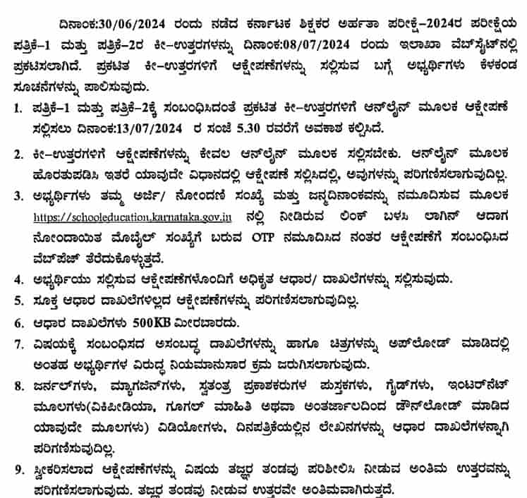 The School Education Department, Karnataka is also inviting objections from the candidates who have any doubts or are not satisfied with any answer. The objection link is provided below. The candidates can login into the provided link using their application number and date of birth and raise their objection before the last date i.e. 13 July 2024.