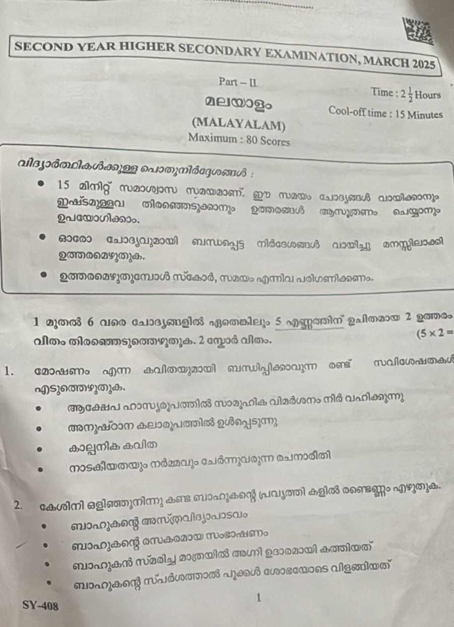 Kerala Plus Two Malayalam Exam 2025 Question Paper