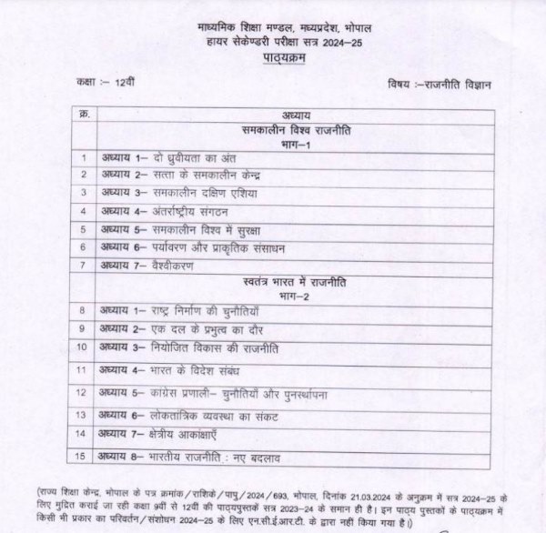 CHECK: MP Board Class 12 Political Science Syllabus 2024-25 Free PDF Download