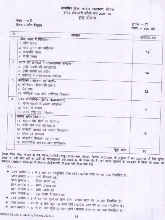 MP Board Class 11 Biology Marking Scheme 2024-25 Download PDF