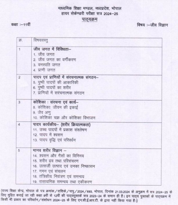 MP Board Class 11 Biology Syllabus 2024-25 Download PDF
