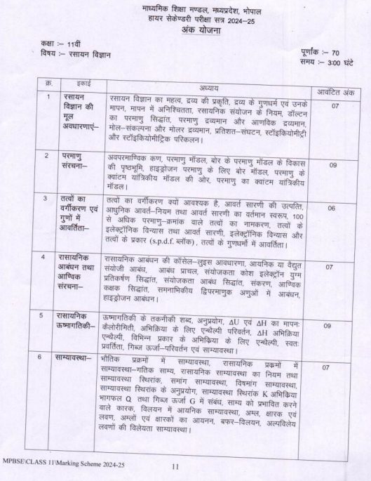 To access the detailed syllabus and marking scheme for Class 11 Chemistry, including the full list of topics, textbooks, and specific question formats, you can download the PDF from the MPBSE official website or the provided link: