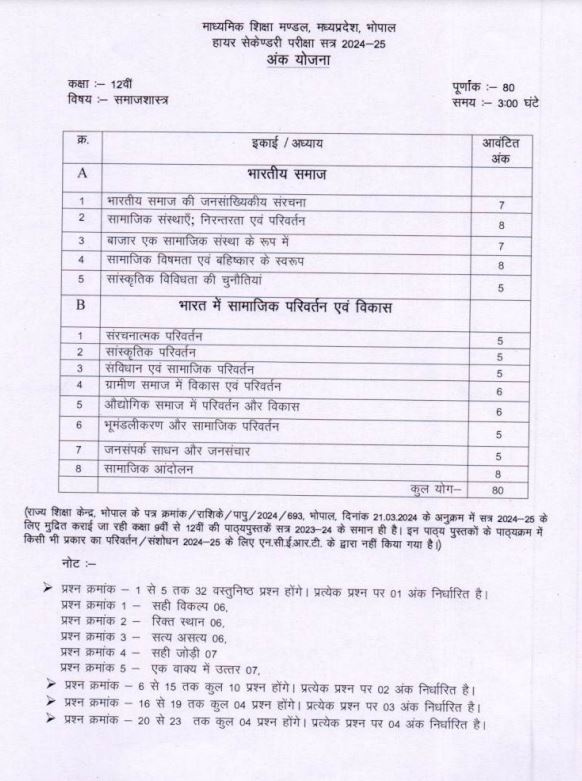 Madhya Pradesh MP Board Class 12 Sociology Marking Scheme 2024-25