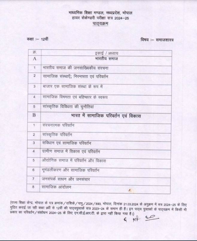 CHECK: Madhya Pradesh MP Board Class 12 Sociology Syllabus 2024-25