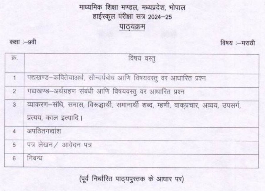 MPBSE 9th Marathi Syllabus 2024-2025: The Madhya Pradesh Board offers various elective language options for students, including Marathi. This section provides the MP Board Class 9 Marathi syllabus and the marking scheme for 2024-25. The Marathi language subject is designed to give students a basic understanding of the language, along with the prose and poetry included in the curriculum. Students can explore the entire syllabus and download the free PDFs available here. This syllabus will help students gain essential language skills while studying Marathi literature in an engaging and structured way.