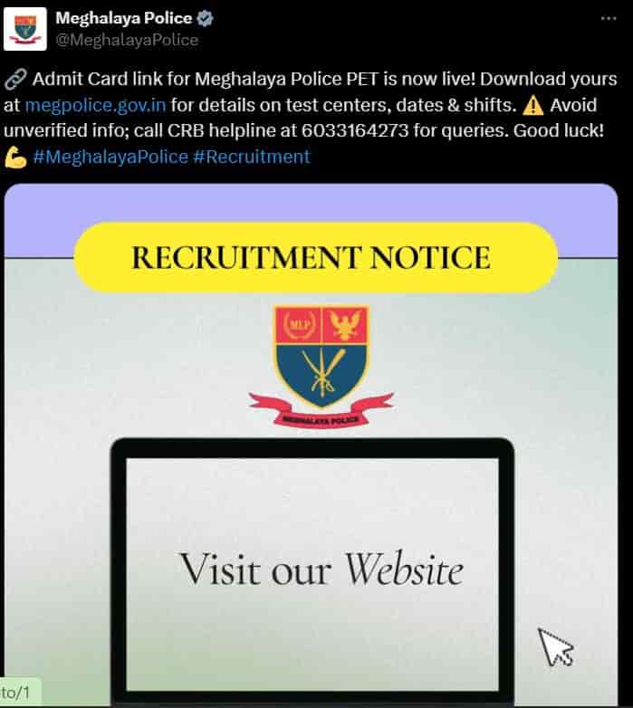 According to the Twitter handle of Meghalaya Police, "ЁЯФЧ Admit Card link for Meghalaya Police PET is now live! Download yours at http://megpolice.gov.in for details on test centers, dates & shifts. тЪая╕П Avoid unverified info; call CRB helpline at 6033164273 for queries. Good luck! ЁЯТк #MeghalayaPolice #Recruitment.
