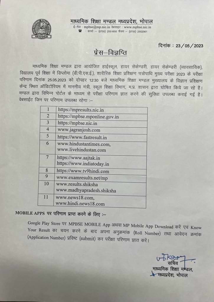 MPBSE 10वीं, 12वीं का रिजल्ट 2023 की तारीख और समय की पुष्टि का प्रेस नोट छात्र नीचे देख सकते है-