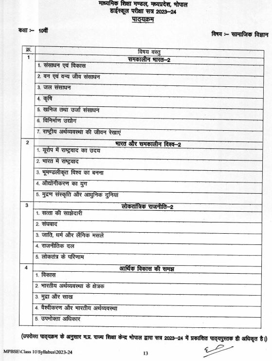 MPBSE Class 10 Social Science Syllabus 2023-2024 in Hindi