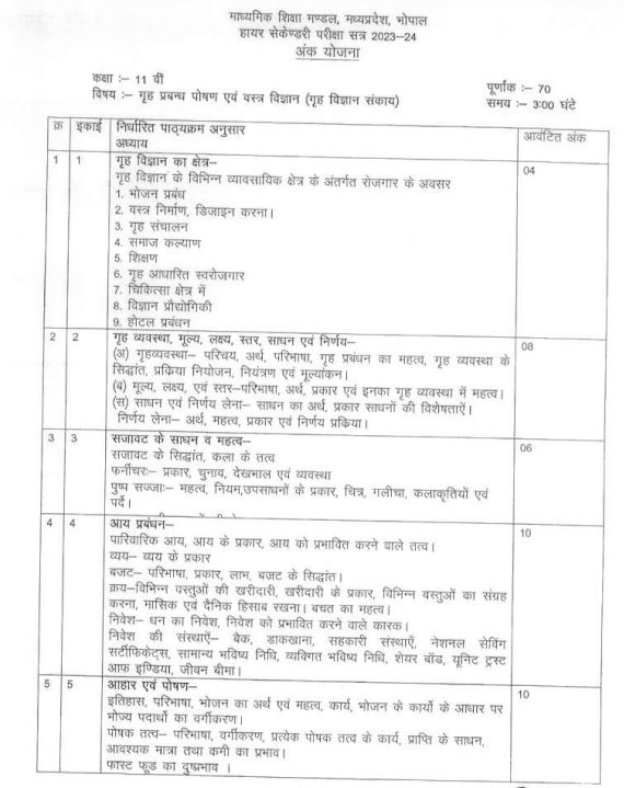 MPBSE Class 11 Home Science Syllabus 2023-2024