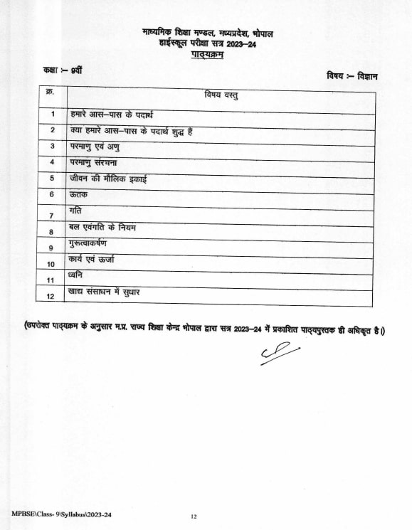 The detailed syllabus for Science for MPBSE class 9th Exam of the academic year 2023-24 is provided here;