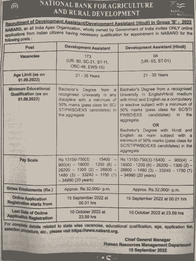 NABARD Development Assistant Recruitment 2022: National Bank for Agriculture & Rural Development (NABARD) is inviting applications for the post of Development Assistant and Development Assistant (Hindi), Group -B Posts on its official website i.e. nabard.org. Graduates are eligible to apply until 10 October 2022. The link to apply is provided below: