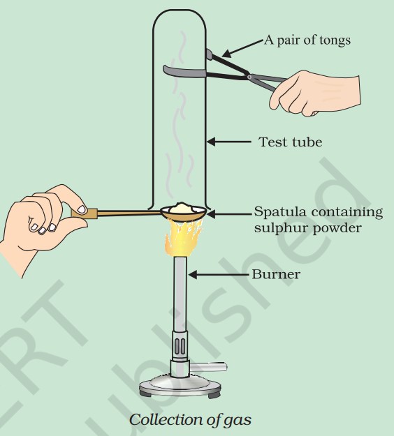 - Pratyush took sulphur powder on a spatula and heated it. He collected the gas evolved by inverting a test tube over it, as shown in figure below.