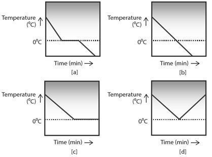 Graph (a) correctly represents the change in the temperature of water as a function of time. At first, water will cool down until its temperature reaches 0 °C. After reaching the freezing point (0 °C) temperature will remain constant until the water becomes ice. On further cooling, the temperature of ice will slowly fall down with time.