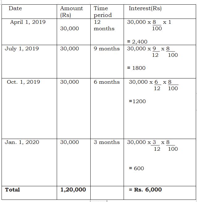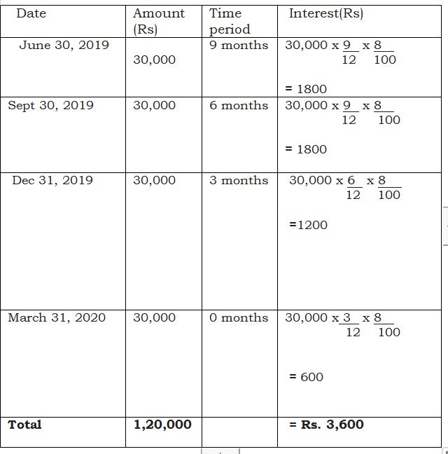 Ans. If a fixed amount is withdrawn on the first day of every quarter, for a period of seven and half months, the interest on the total amount withdrawn will be calculated.