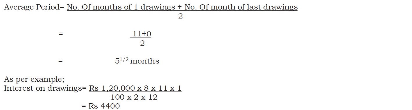Example: Shakila withdrew Rs. 60,000 from the partnership firm during the year ending March 31, 2020 and the interest on drawings is to be charged at the rate of 8 per cent per annum. For calculation of interest, the period would be taken as six months, which is the average period assuming, that amount is withdrawn evenly in the middle of the month, throughout the year. The amount of interest on drawings works out to be Rs. 2,400 as follows: